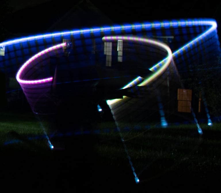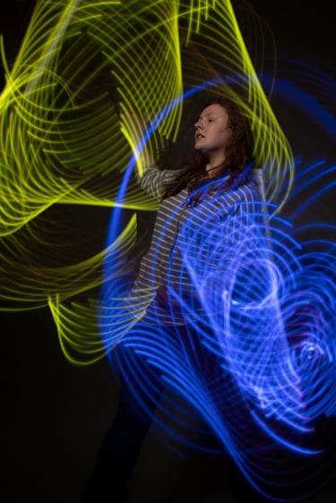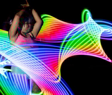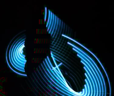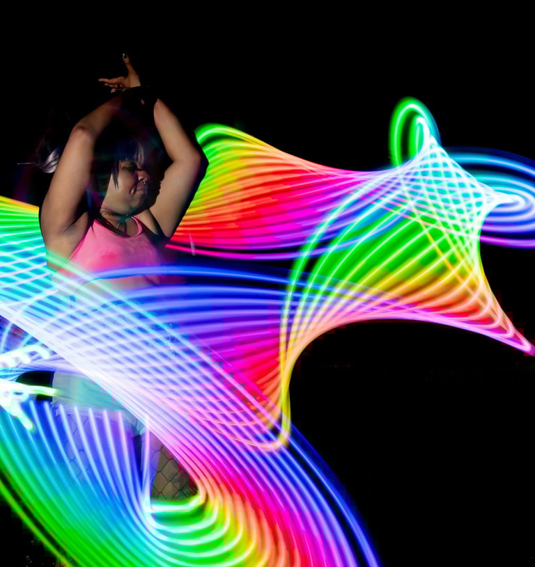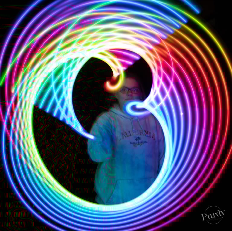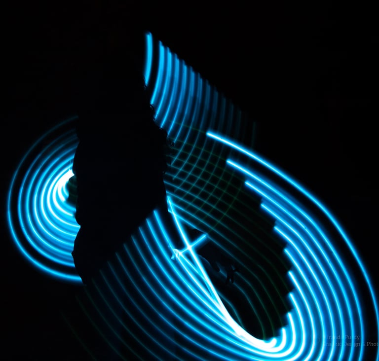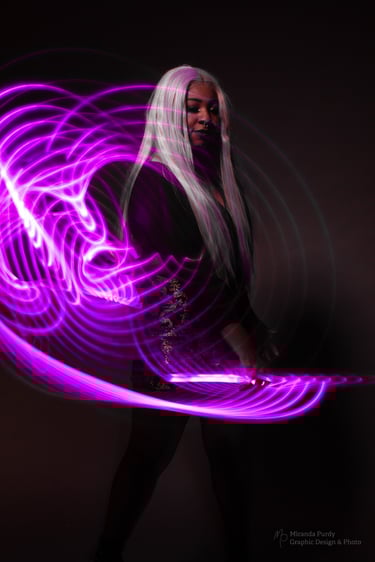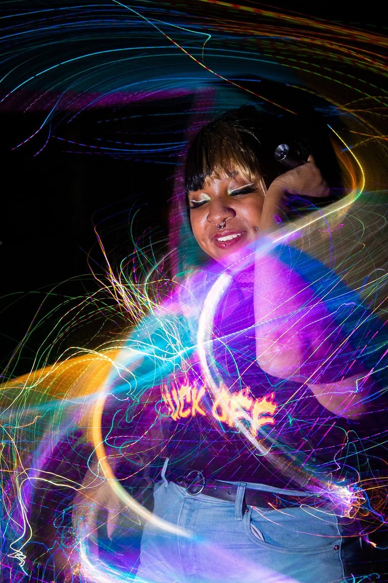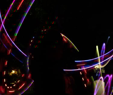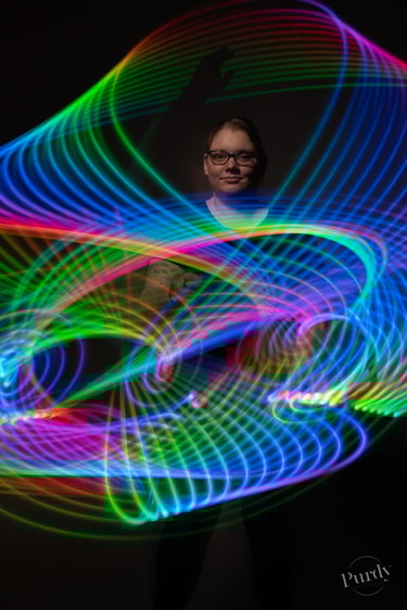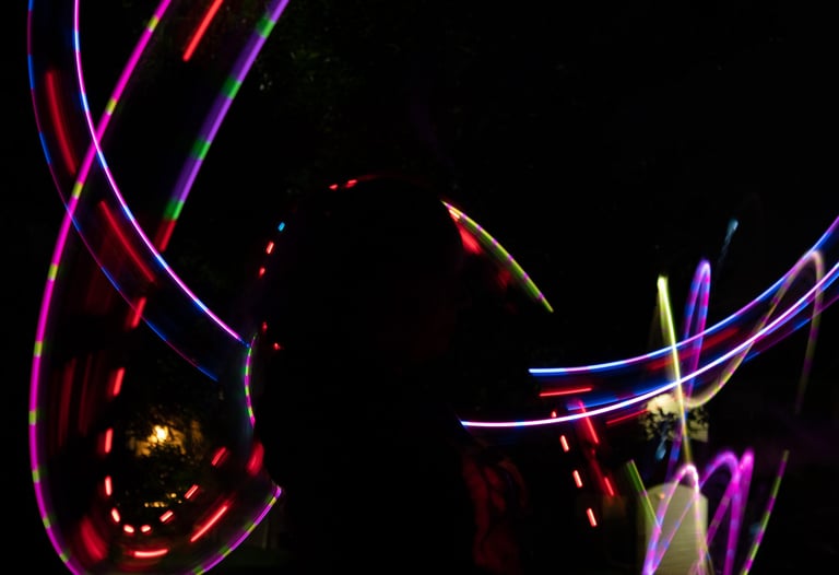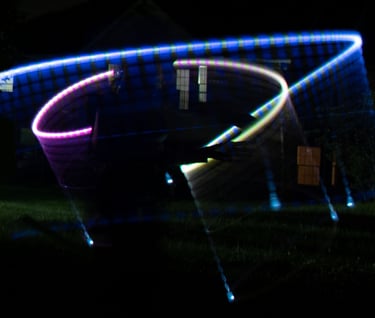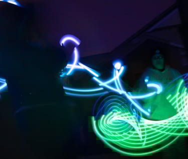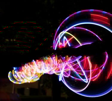 We began our light journey back in 2020 with some cheap flow toys and began learning how to use them and photograph them in the backyard of my apartment complex. These images were the first major step in our effort to capture interesting light painting images. In this set of images, we used an orbit toy and a basic levitation wand.
